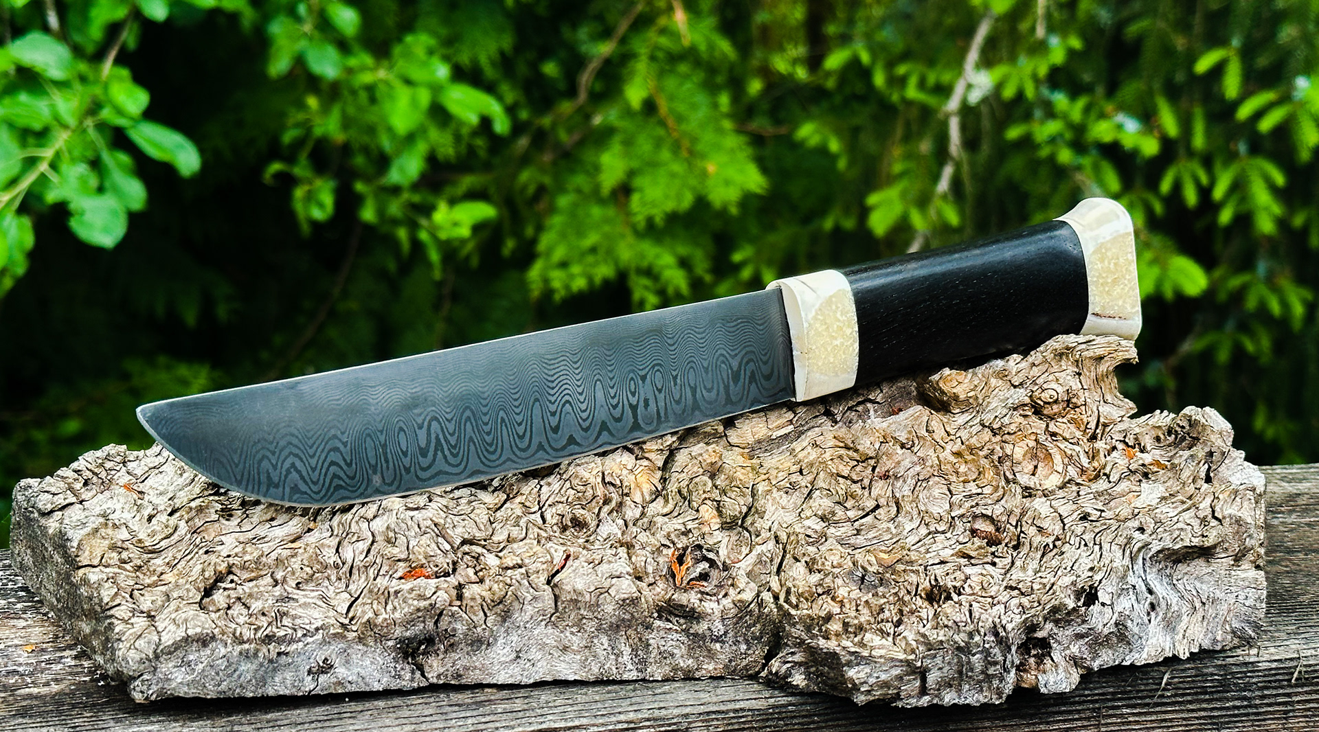 Puukko, patternwelded core with stainless cladding (san mai), sterling silver bolster, spacer and buttplate with 5000 year old bog oak