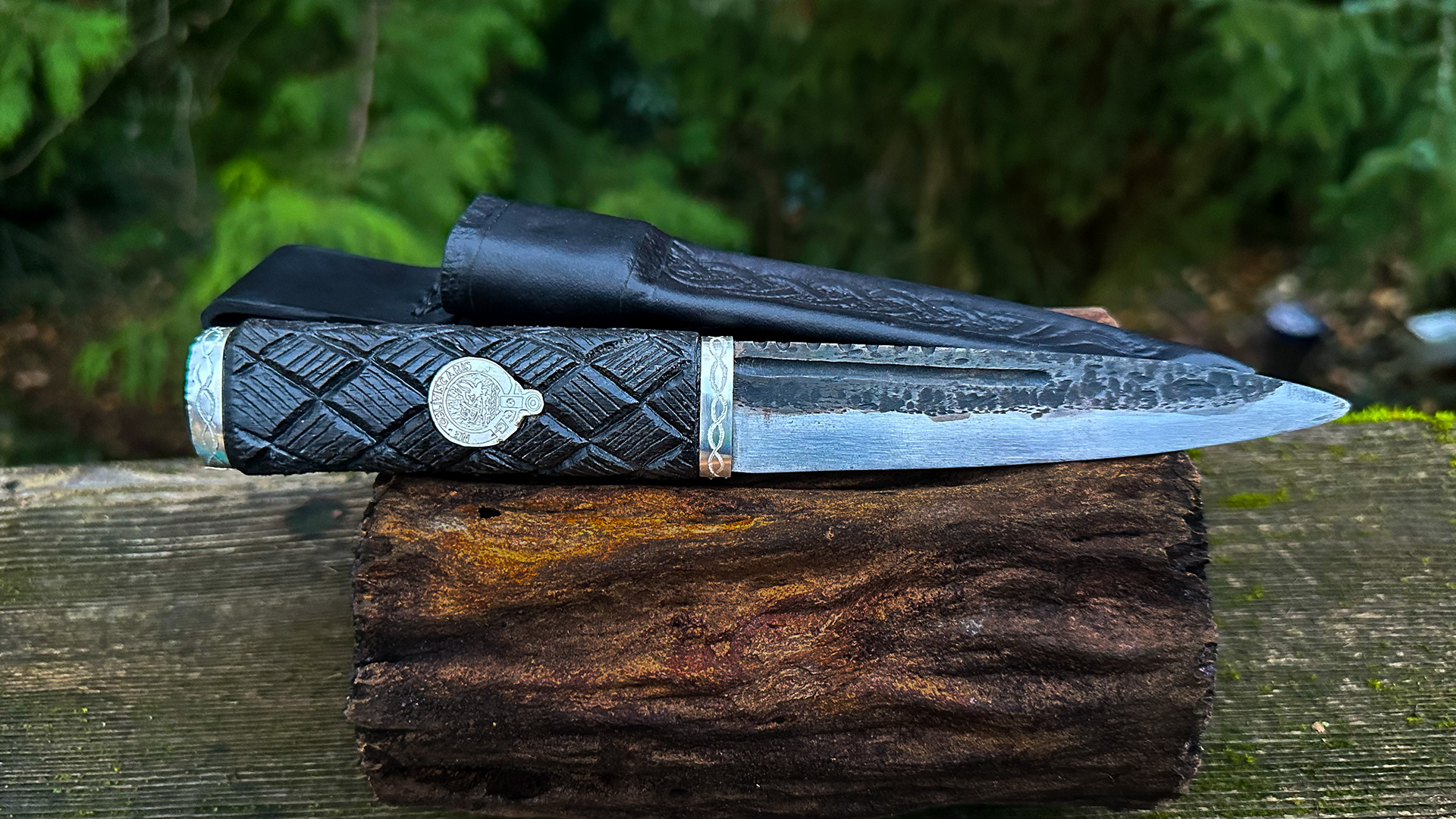 Scottish Dirk, 80crv2 blade, with carved maple burl grip. Bronze plates
