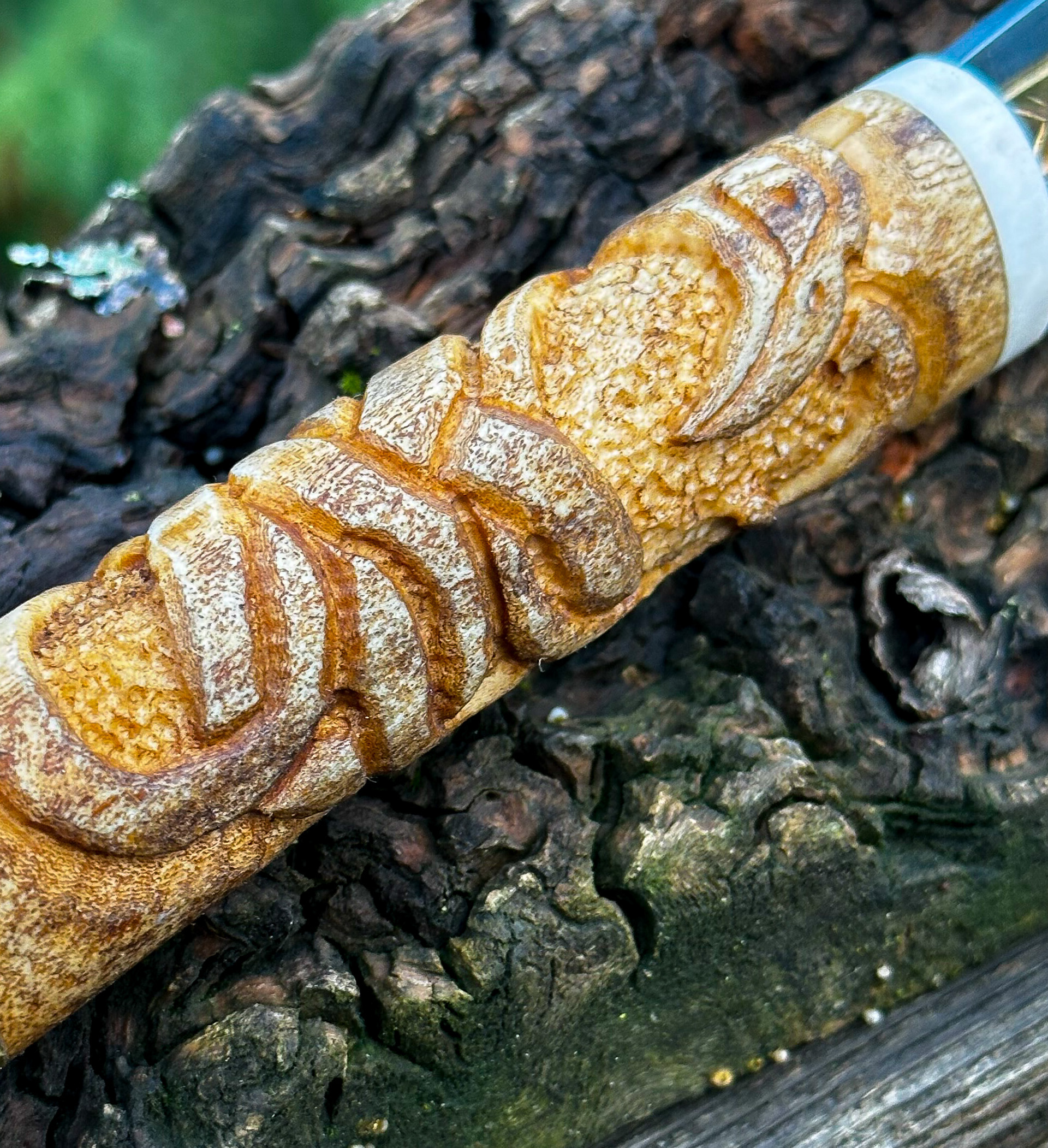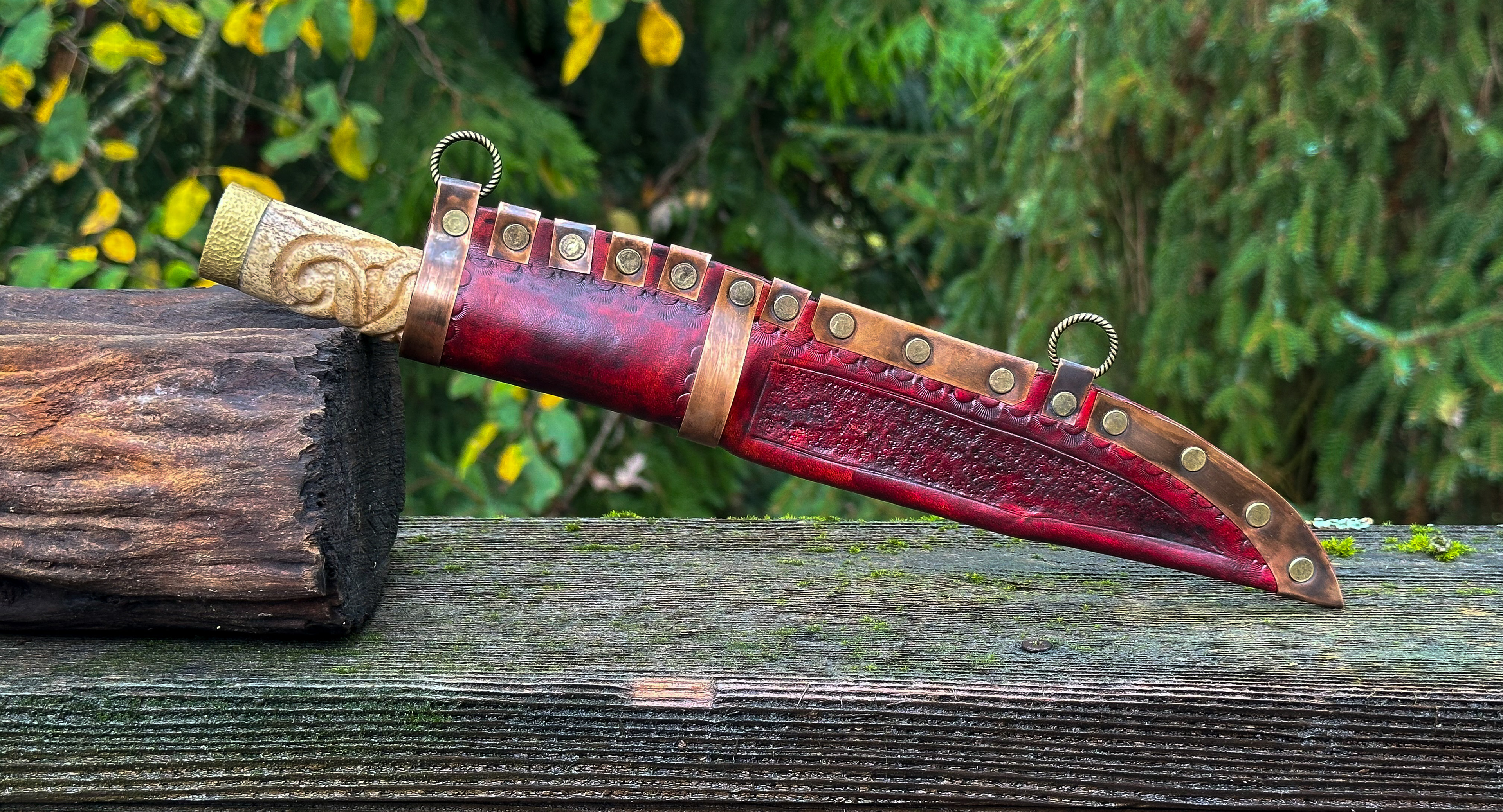 large seax, 80crb2 blade with engraving and 24 karat gold plating, grip is poplar wood with oak burl end caps, and wrapped in salmon leather
