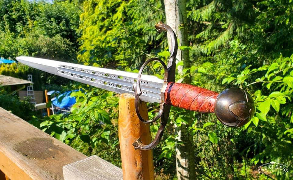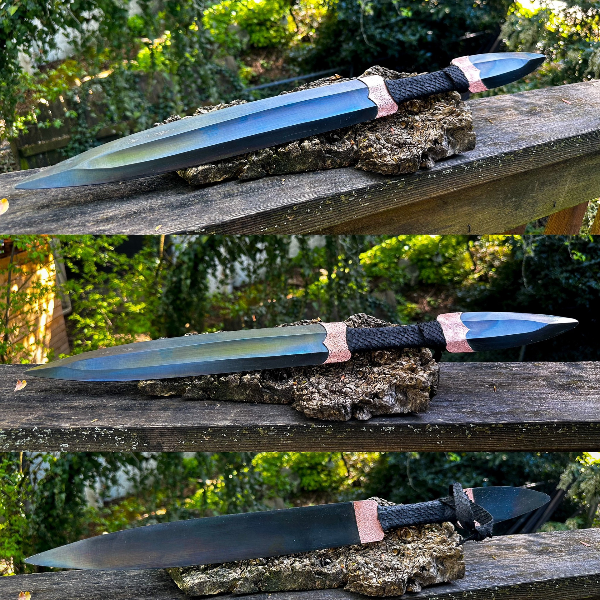 XIV arming sword. 1095 carbon steel, insert is hammered float copper. Inspired by a surviving sword from the 14th century.