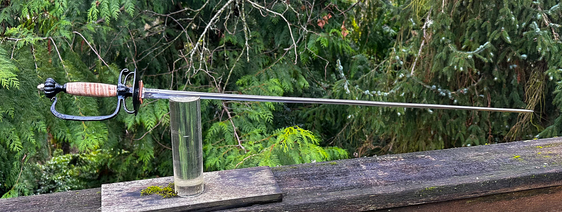 swiss degen. I've lost some of my specs on this. but 5160 blade with wrought iron guard and pommel with brass pins, zebrawood handle.