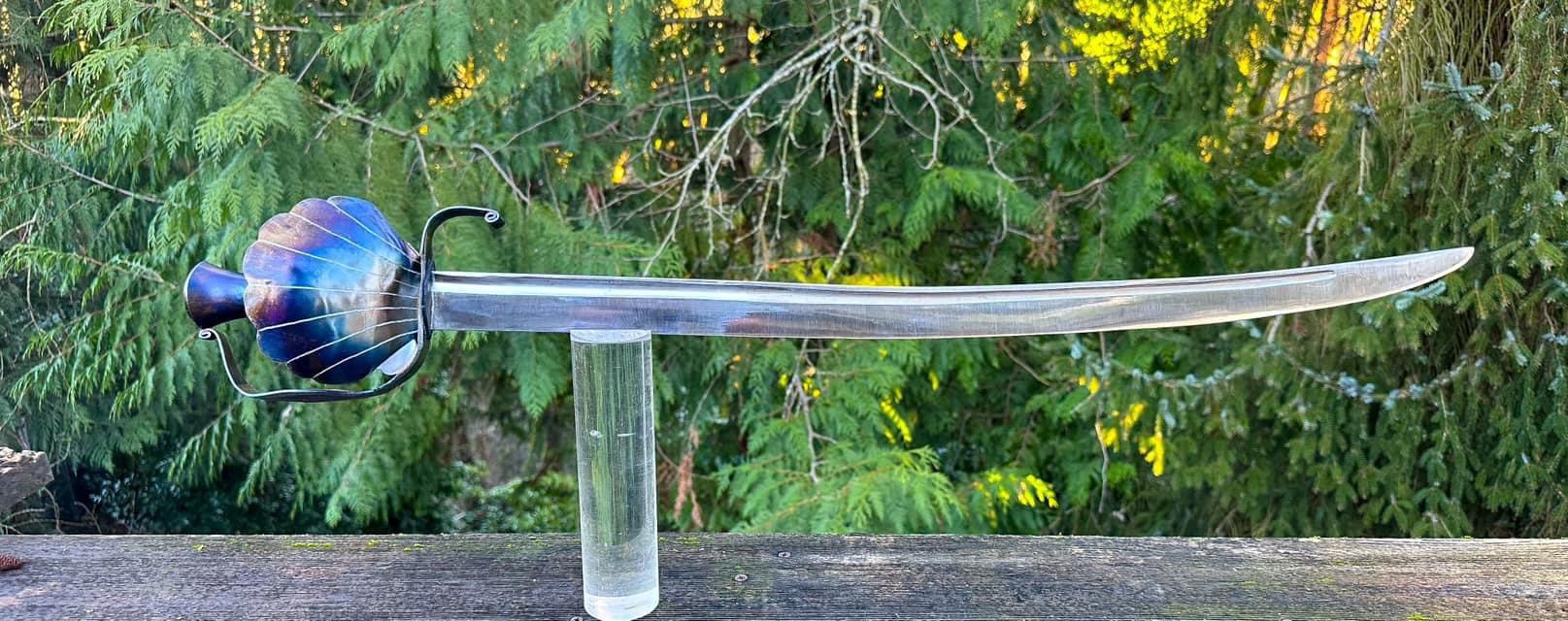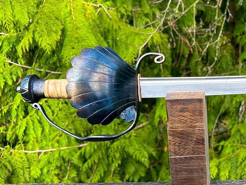Triple Shell Cutlass. Blade is 5160, with a guard forged out of a single sheet of 12 gauge steel. Engraved pommel with a fluted maple grip handle.